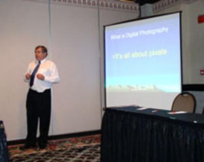 New Jersey Chapter Seminar on Digital Photography On June 14, 2002, The New Jersey Chapter of the UESA, headed by Mr. Mattey Rakowsky, presented a successful seminar on the theory and practice of digital photography, at the Ramada Inn and Conference Cenetr in East Hanover, NJ. The goal of the event was to interest members of the community in a topic which is both technical and of practical interest to many. ![]() The keynote speaker at the seminar was Mr. Ihor Lukiw, who displayed a depth of knowledge on topics including the concept of digital resolution, the differences between film-based photography and digital photography, and what to consider when buying a digital camera. Digital cameras, he noted, have benefits over film-based cameras in the areas of cost (no film to buy) and the ability to see a photo immediately after it is taken. Whether taken with a digital camera or scanned from traditional prints, digital photos can also be edited and manipulated for creative and quality control. The key to buying an approrpriate digital camera, Mr. Lukiw noted, is understanding what features are needed by the buyer, and which are available within the price range one is willing to spend. ![]() Mr. Lukiw was followed by Mr. Andrij Wowk, UESA president and a member of the NJ chapter, who presented an overview of digital resolution and how it applies to manipulating and printing digital photographs. Comparing the individual components of a digital photo - known as pixels - to marbles in a box, Mr. Wowk noted that one must always keep the number of "marbles" in a photo in mind to achieve good image quality. The final speaker of the day was Mr. Pavlo Mulyk, a student member of the New York City UESA chapter, who presented an overview of the popular image-editing program Adobe Photoshop. Mr. Mulyk gave a real-time demonstration of some of the capabiilities of this software, which include altering the size, resolution, color, contrast/brightness, and other characteristics of an image, as well as making a copy of (or hiding) part of an image. Attendees at the event included UESA members and the general public, as well as one UESA Detroit chapter member who flew in especially for the event One satisfied participant, a member of the UESA New York City, called the seminar "the most interesting UESA event in the past 10 years". Back ... | |||||||||||