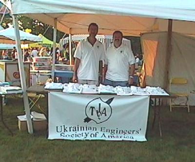 Verkhovyna Youth Festival Glen Spey, New York This year the 27th Annual Verkhovyna Ukrainian Youth Festival was back in the green mountains of Glen Spey, New York. The Ukrainian American Cultural Foundation is working hard to modernize the facilties so that future generations of Ukrainian-Americans can continue to enjoy the property. The Ukrainain Engineers' Society of America decided to hold a small fundrasing effort to help support the Ukrainian American Cultural foundation's efforts to rebuild the resort. The Society set up a booth which in addition to having information about the organization had high quality, 100% cotton white polo shirts emblazed with the UESA or "TYIA" logo, the Society's web site address, and our new slogan - "Your link to the future" The Society will donate all the profits from the sale of the shirts at the Festival to the UACF. ![]() Marco Shmerykowsky PE and Wasyl Kinach PE The booth at the Festival was a complete success entirely to the efforts of Wasyl Kinach, his brother Mykola Kinach and their niece Catherine Anderson. In addition to selling the shirts, the Kinachs distributed several applications and UESA informational pamphlets. Thanks to their efforts, several young professionals learned more about UESA. ![]() National Board Member Wasyl Kinach PE If you would like to purchase a UESA shirt, please send an e-mail to nyc@uesa.org or write to us at: Ukrainian Engineers Society of America, 2 East 79th Street, NY, NY 10021 ![]() Enlargement of UESA shirt logo ![]() UESA shirts on display at Verkhovyna Back ... | |||||||||||